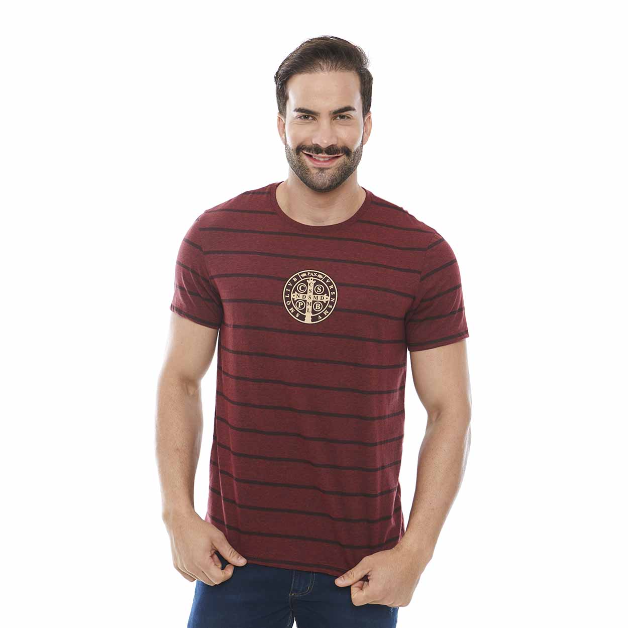 Camiseta Medalha de São Bento em estampa discreta para vestir com muita devoção confiando em sua proteção. Camiseta listrada, com bela aplicação em silk que produz um visual sofisticado na peça e meia malha para um conforto único para o seu dia a dia e ocasiões especiais. -Pode haver variações de medidas nas peças de até 2 cm, na largura e comprimento. -A depender da malha utilizada no processo de confecção, pode haver variação no tamanho da peça para garantir melhor vestibilidade.